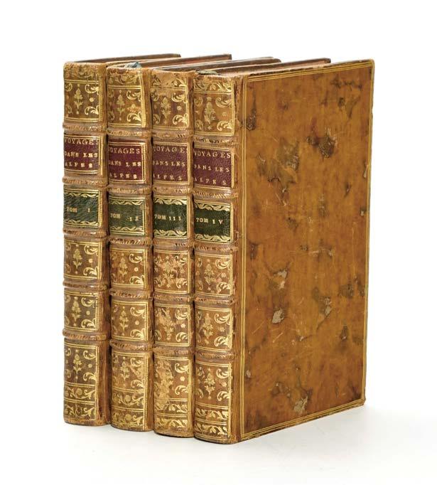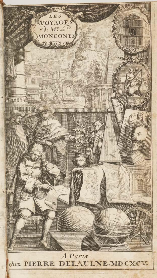 30. MONCONYS (Balthasar de, 16111665) : Les Voyages de Monsieur de Monconys... où les Savants trou veront... En Syrie et en Natolie. En Angleterre et aux Pays-Bas. En Allemagne et en Italie. En Espagne. Paris, Delaulne, 1695. 4 vol. in-12, veau fauve marbré, dos à nerfs ornés, triple filet doré sur les plats, tranches jaspées. Reliure de l’époque. Bel exemplaire, bien relié ; il comprend de curieuses figures gravées H.T. et un beau titre frontis pice (petites usures des reliures). 300/500