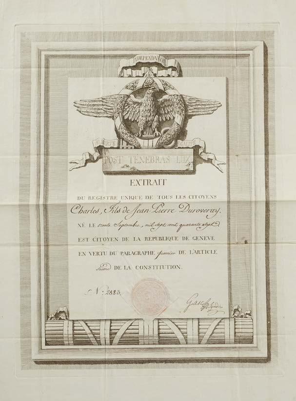 12. GENEVE. Important ensemble de documents manuscrits (pour 24 d’entre eux) et imprimés (pour les quatre derniers), concernant principalement la navigation et les barques sur le Lac Léman, concédée au sieur Charles Duroveray, citoyen de Genève, né le 30 septembre 1747.