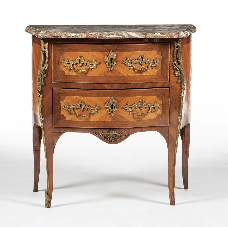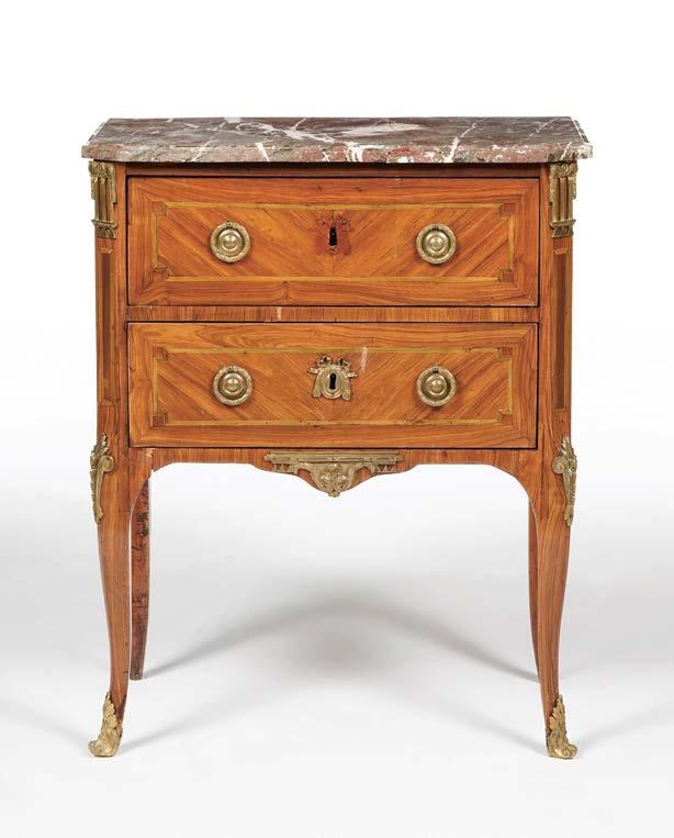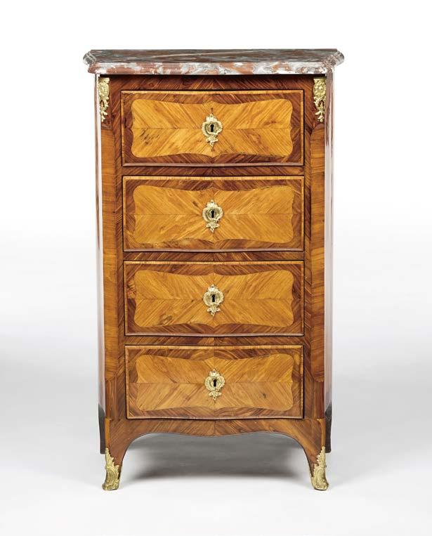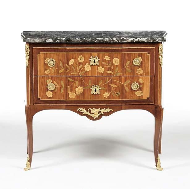 1255. Commode, circa 1940 Cinq tiroirs sur trois rangs, marqueterie géométrique de loupe et bois foncé sur fond d’acajou, 100 x 110 x 55 cm 300/500