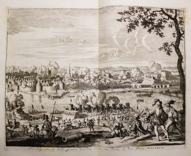 29. GROOTS (Hugo De) : Nederlantsche Jaerbocken en Historien. Amst. 1681. Un vol. in-folio, veau brun granité, dos à nerfs, filets estampés. Reliure de l’ép. Bel ex. comprenant un frontispice, 18 culs-de-lampe, 27 pl. à double page H.T. et 20 portraits H.T. gravés. Petite déchirure aux pp. 290-291. 400/500