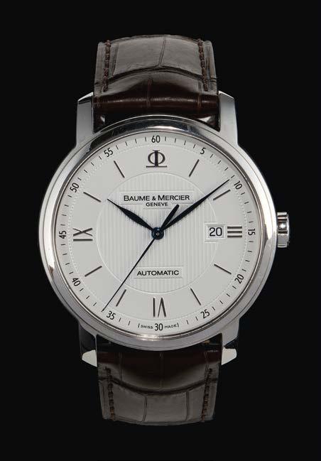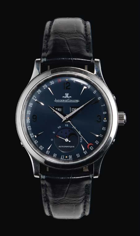 Cadran gris, aiguilles bleues, chiffres romains et index bâtons argentés, date à guichet à 3 h, acier, D 42 mm 600/800