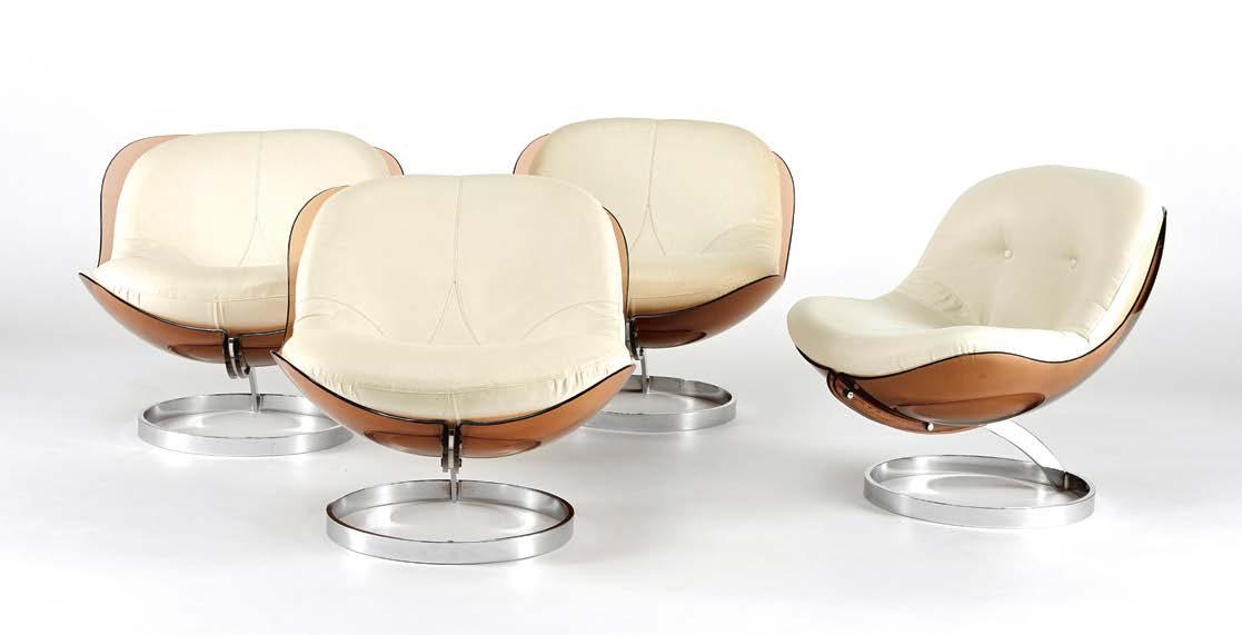 1180. Boris Tabakoff (1927-2985) Quatre fauteuils sphère, plexiglas fumé, acier chromé et simili cuir blanc 800/1200