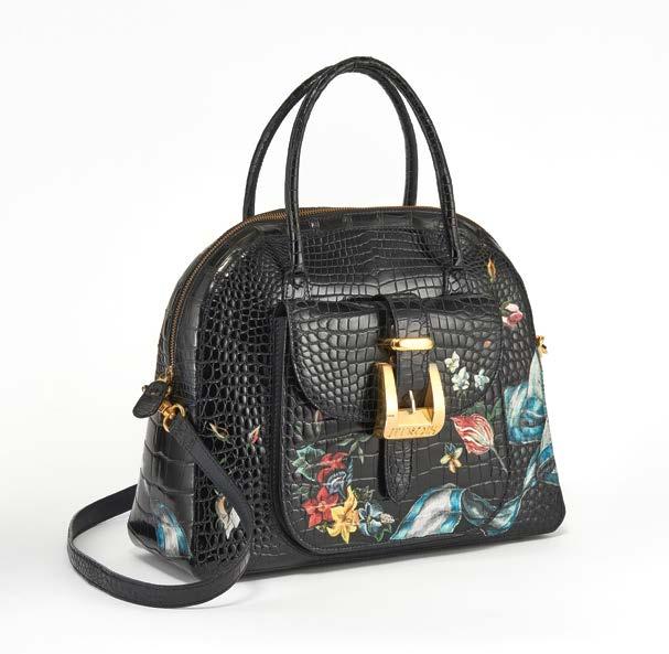 Cuir de crocodile bleu marine peint de motifs floraux, intérieur en cuir lisse bleu marine, garniture en métal doré, 28 x 35 x 13 cm 400/600