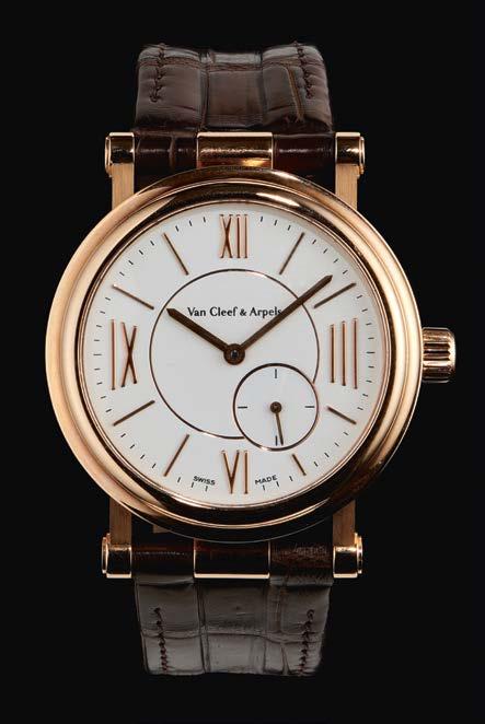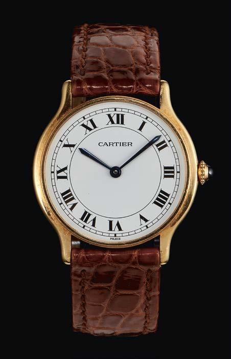 33. Cartier, montre ronde mécanique Cadran crème, aiguilles bleues, chiffres romains noirs, remontoir serti d’un saphir, or 750, D 31 mm, poids brut 36 g 1500/2000