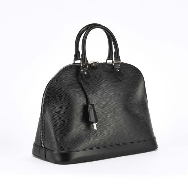 Cuir épi noir, intérieur en daim gris, garniture en métal argenté, fermeture Eclair à cadenas, 29 x 39 cm 400/600