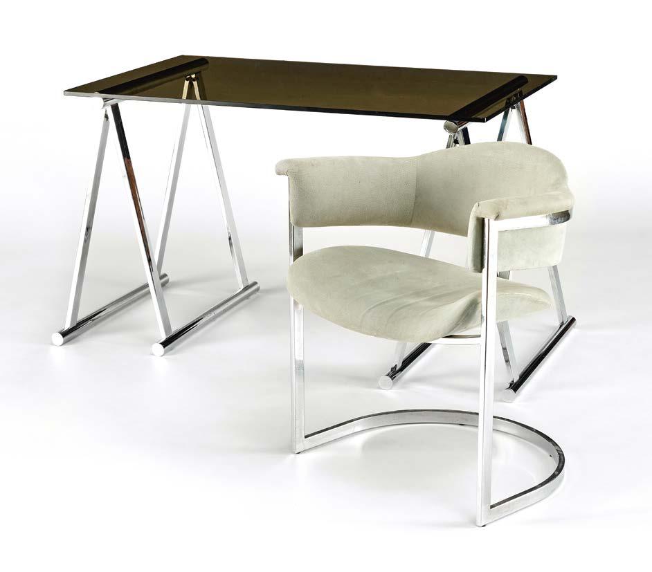 Acier chromé, verre fumé, tissu vert d’eau, 71 x 115 x 70 cm 200/300