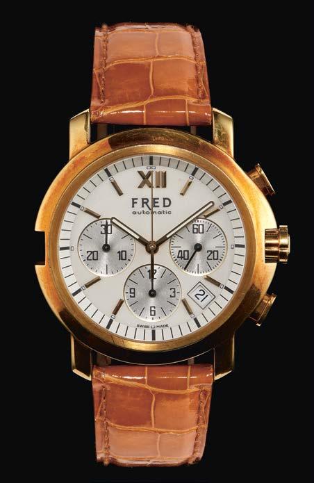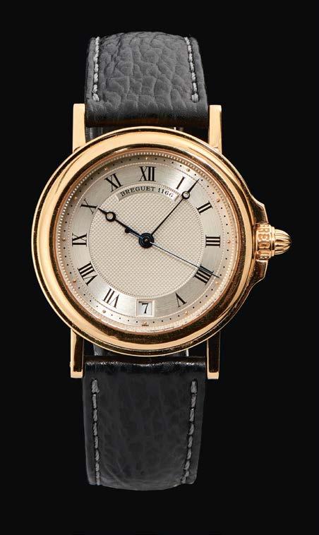 Cadran nacré, aiguilles dorées, index à points sertis de diamants, chiffres romains gravés sur la lunette, date à guichet à 6 h, or 750, D 24 mm, poids brut 71 g 1500/2000