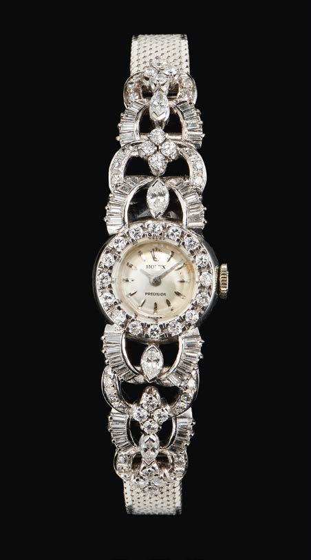 24. Rolex, Précision, montre-bracelet ronde mécanique sertie de diamants taille brillant, marquise et baguette Cadran gris, aiguilles et index bâtons argentés, or gris 750, D 14 mm, L 18 cm, poids brut 25 g 600/800