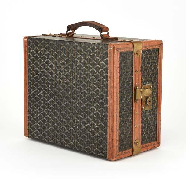 Toile enduite Goyardine et cuir brun, garniture en métal doré, intérieur à quatre compartiments, 30 x 36 x 20 cm 300/500