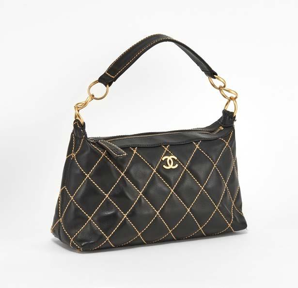 Cuir lisse noir matelassé de fil beige, intérieur en toile noire monogrammée, garniture en métal doré, 15 x 30 cm 200/300