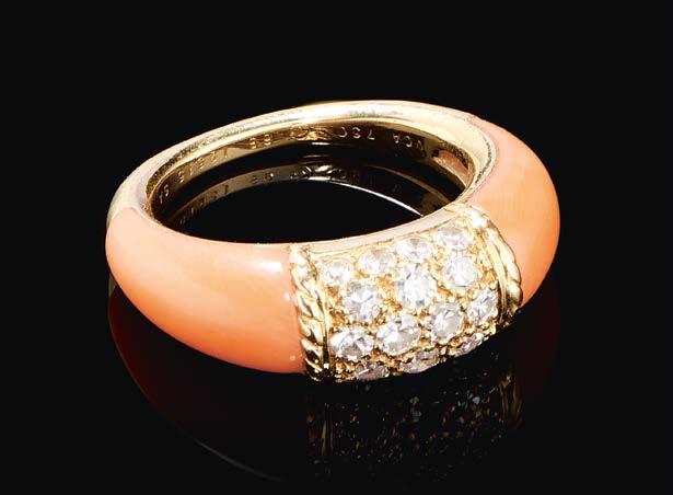 Cadran corail, aiguilles dorées, or 750, 24 x 26 mm, poids brut 25 g 800/1200