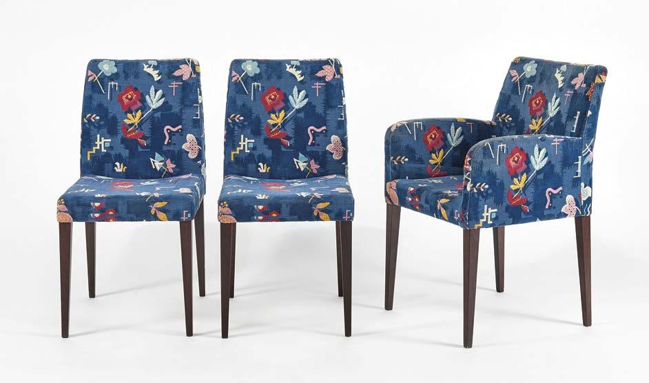 965. Paire de chaises et un fauteuil Liz par Poltrona Frau Hêtre teinté noir, garniture en tissu bleu à motifs floraux stylisés 400/600
