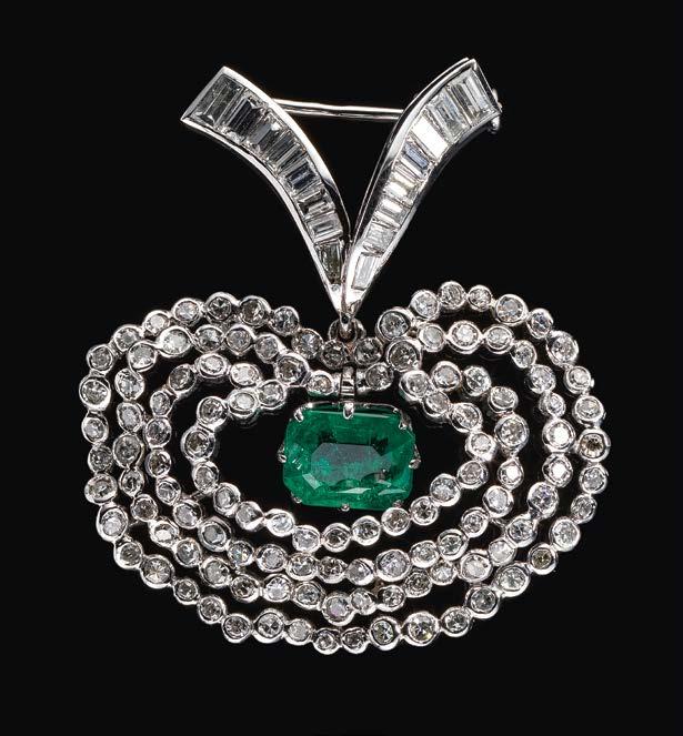 22. Broche retenant un motif mobile centré d’une émeraude taille émeraude (env. 2 ct) entourée de quatre cercles ajourés sertis de diamants (env. 1.2 ct) et rehaussés d’un motif de V pavé de diamants taille baguette