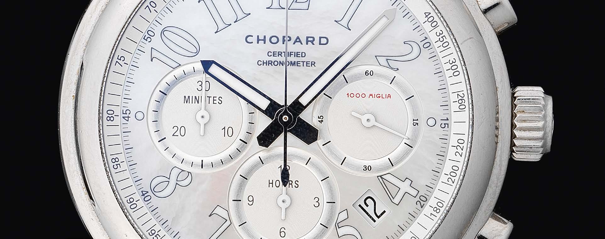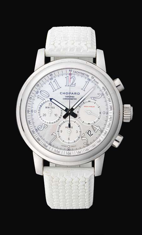 6. Chopard, Mille Miglia, montre chronographe ronde automatique Cadran nacré, aiguilles argentées, chiffres romains blancs, date à guichet entre 4 h et 5 h, acier, D 42 mm, avec son certificat d’origine 1000/1500