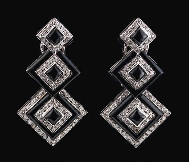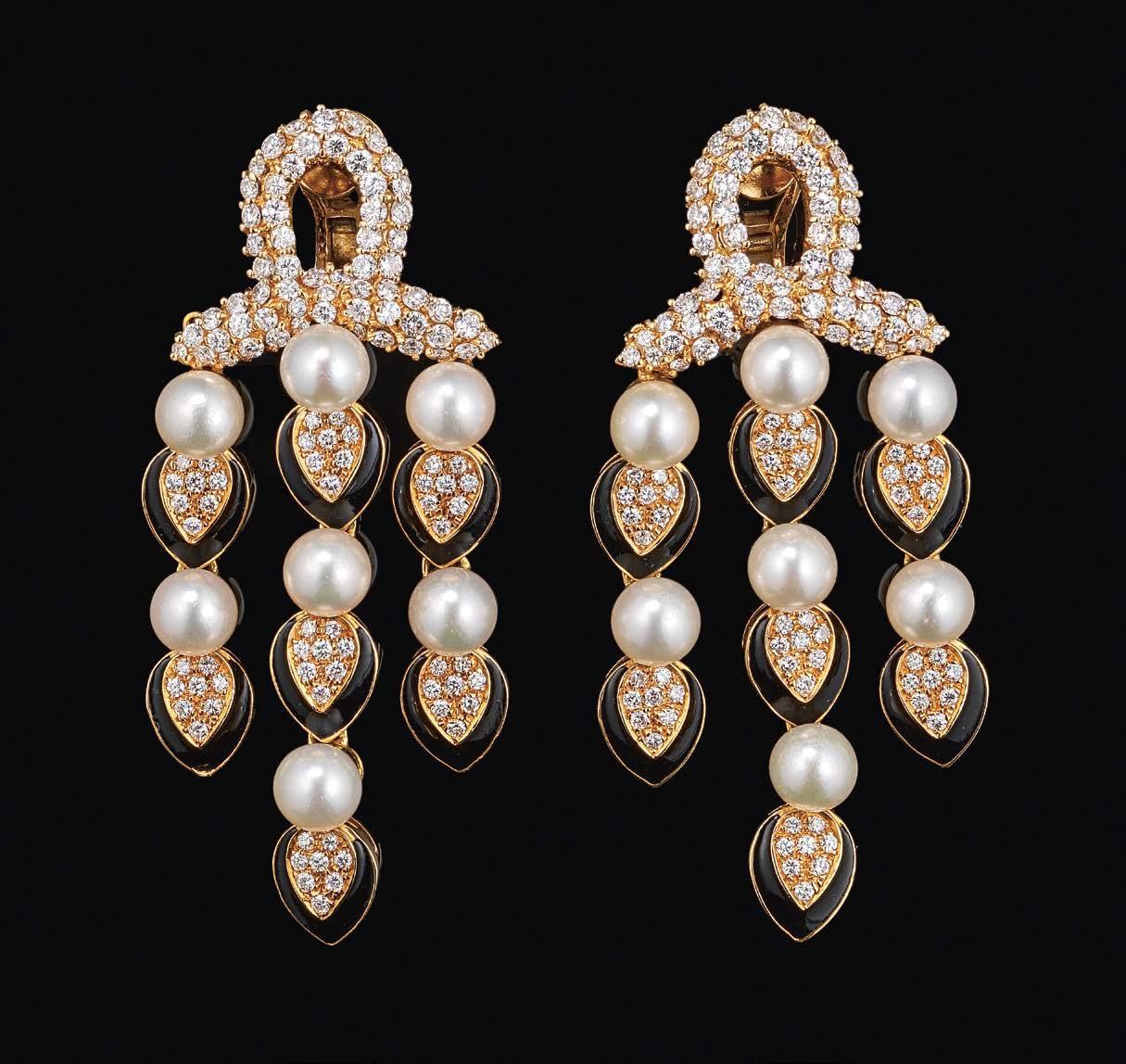 31. Pendants d’oreilles retenant trois motifs mobiles en girandole composés de gouttes émaillées noires pavées de diamants, alternées de perles (D env. 8 mm), le tout rehaussé d’un motif pavé de diamants (total env. 4 ct)
