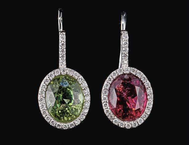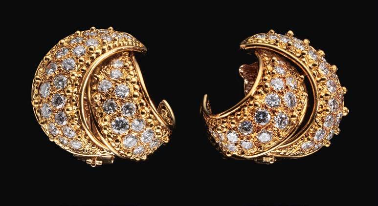 27. Vourakis, clips d’oreilles en forme de gouttes centrées d’un corail peau d’ange taille cabochon ovale (env. 13.5 x 11 mm) entouré de pavages de diamants (env. 1.9 ct) et rehaussé de perles (D env. 4 mm) Or 750, H 3 cm, 29 g 1200/1800
