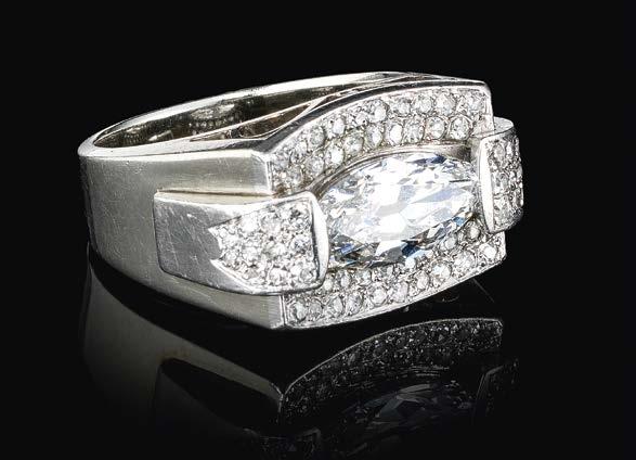 21. Bague asymétrique à motif de coquillage centré d’un diamant taille ancienne en serti clos (env. 0.8 ct) et rehaussé d’étoiles serties de diamants