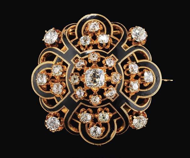 19. Broche-pendentif ajourée émaillée noire centrée d’un diamant coussin taille ancienne (env. 0.8 ct) entouré de diamants taille ancienne (env. 2.5 ct)