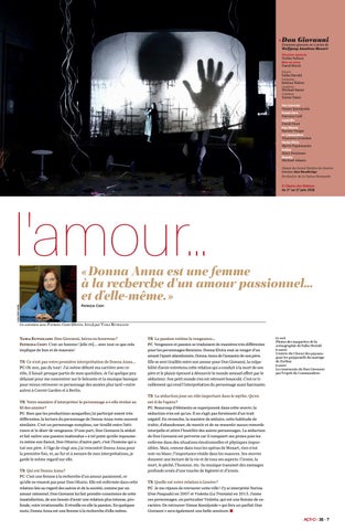 TR La séduction joue un rôle important dans le mythe. Qu’en est-il de l’opéra ? PC Beaucoup d’éléments se superposent dans cette œuvre ; la séduction n’en est qu’un. Il ne s’agit pas forcément d’un trait négatif. En revanche, la manière de séduire, cette habitude de trahir, d’abandonner, de mentir et de ne ressentir aucun remords interpelle et attire l’hostilité des autres personnages. La séduction de Don Giovanni est perverse car il conquiert ses proies puis les enferme dans des situations émotionnelles et physiques impossibles. Mais, comme dans tous les opéras de Mozart, rien n’est noir ou blanc ; l’importance réside dans les nuances. Ses œuvres donnent une lecture de la vie et de tous ses aspects : l’ironie, la mort, le pêché, l’humour, etc. Sa musique transmet des messages profonds ornés d’une touche de légèreté et d’ironie. TR Quelle est votre relation à Genève ? PC Je me réjouis de retrouver cette ville ! J’y ai interprété Norina (Don Pasquale) en 2007 et Violetta (La Traviata) en 2013. J’aime ces personnages, en particulier Violetta, qui est une femme de caractère. De retrouver Simon Keenlyside – qui fera un parfait Don Giovanni – sera également une belle aventure. ■ ACT- O | 35 . 7