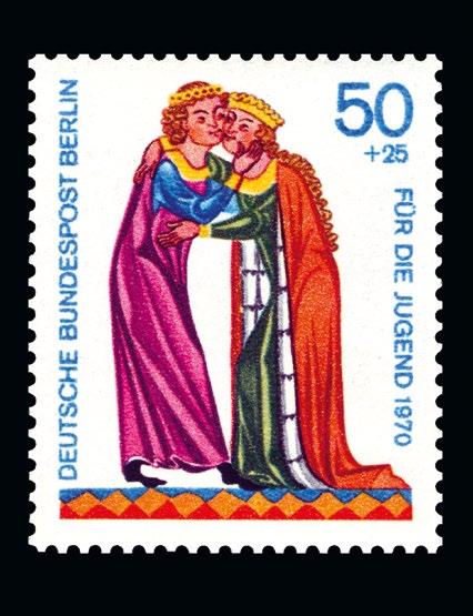 1 Timbre-poste de la Deutsche Bundespost Berlin représentant le Minnesänger Albrecht von Johannesdorf (c.1180-c.1209). Entre 1969 et 1970, la poste allemande sortait des timbres présentant des scènes de l'amour courtois © Historic Images / Alamy Banque D'Images