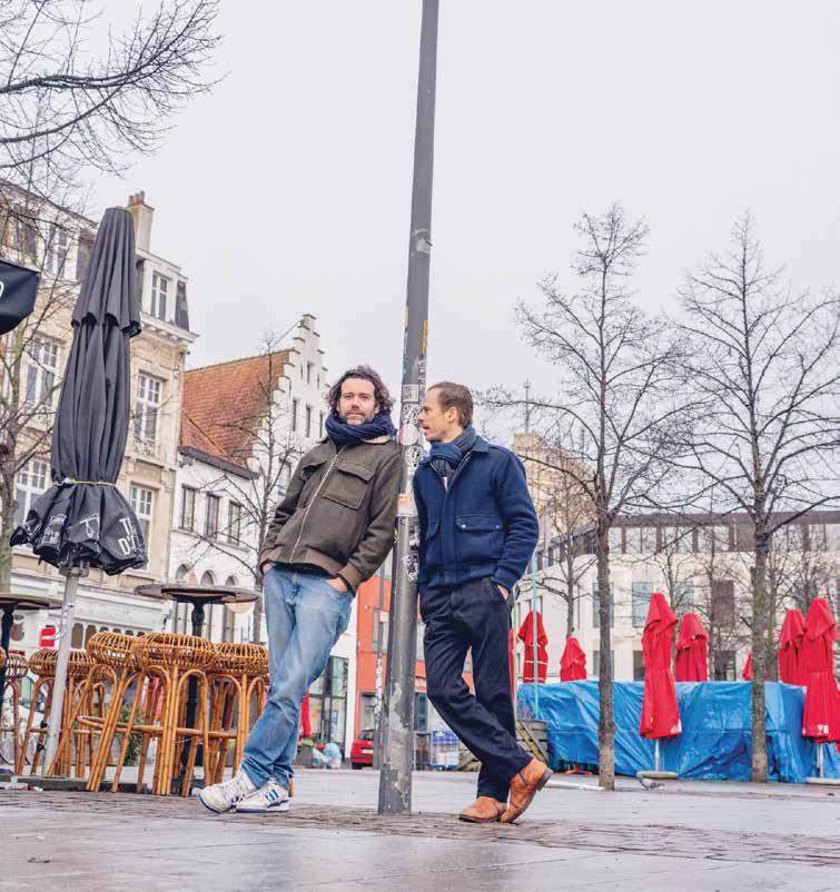 Thomas Verstraeten (à gauche) et Stef Aerts devant le bistrot de leur jeunesse, sur la Mechelseplein, place où se trouvait leur école de théâtre. C’est là où ils sont devenus adultes, confient-ils, là