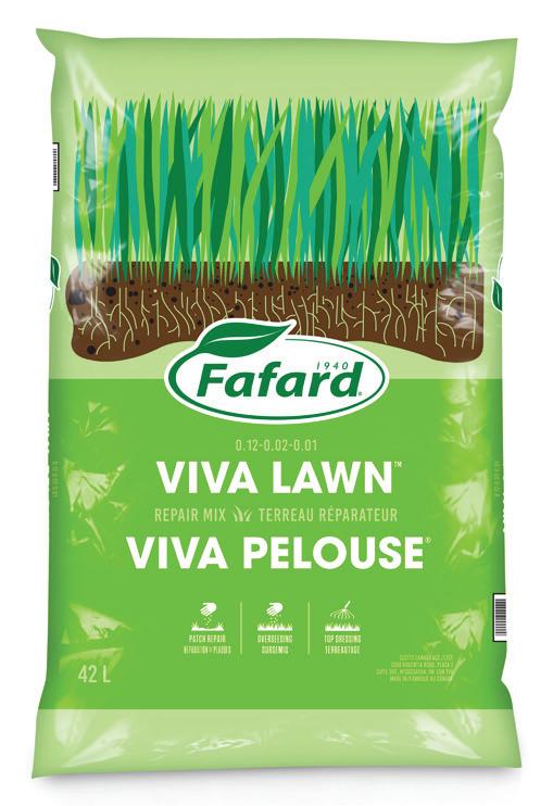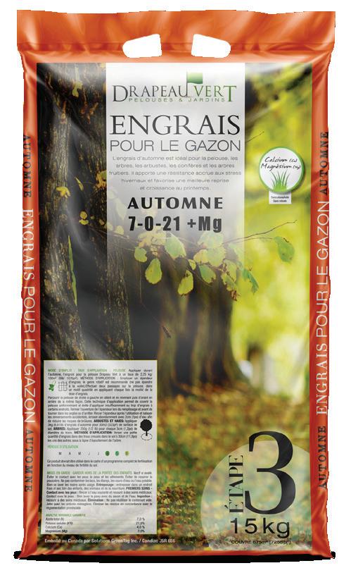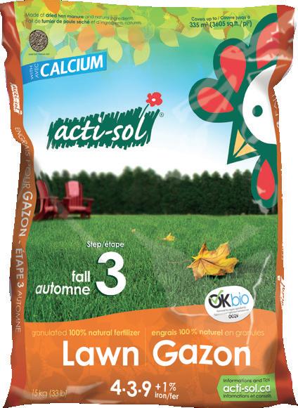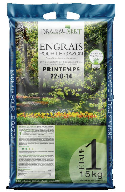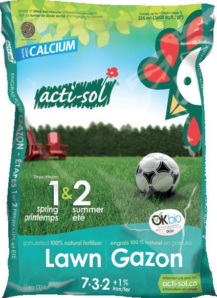 Pour une dissolution plus rapide, arroser juste après, sauf s’il y a présence de rosée. Forafasterdissolution,waterrightafterunlessthereisdew. ENGRAIS À GAZON DRAPEAU VERT À DÉGAGEMENT LENT POUR UNE FERTILISATION PROLONGÉE! Couvre 7 500 pieds2 SLOW RELEASE FOR EXTENDED FERTILIZATION! Covers 7,500 square feet DRV-EP1P15 • DRV-EP2E15 • DRV-EP3A15 DRV-EP1P10 • DRV-EP2E10 • DRV-EP3A10 ACT-73215 • ACT-43915 FORMAT 10 KG 7944$ FORMAT 15 KG 10944$ PROMO 8944$ PROMO 597$ Rég. 7,79$ BIOSOL fumier composté avec tourbe + algues + crustacés Compostedmanurewithpeat+seaweed + crustaceans 30 L HERBIONIK Semences Trèfle blanc Seeds White Clover 750g HERBIONIK Semences à gazon Grass seeds 3,5kg PROMO 1894$ Rég. 24,99$ PROMO 5444$ Rég.68,99$ PROMO 797$ Rég. : 9,99$ Terreau réparateur VIVA PELOUSE Fafard VIVALAWNRepairmix 12kg SCOTTS Lawn Response 9-1-1 4,8kg PROMO 2794$ Rég. 42,99$