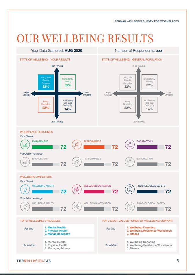 The survey (which we recommend is completed at the start and end of the programme) shows how your colleagues score against the 6 areas of wellbeing within the PERMAH model namely;