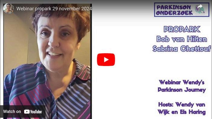 In deze video zijn te gast Prof. Em. Bob van Hilten en projectcoördinator Sabrina Chettouf. Zij geven uitgebreid informatie over het ProPark onderzoek, wijzen ons op de nieuwsbrief (Nieuwsbrief ProPark 2024 – tweede editieProfilering van Parkinson (proparkinson.nl)) en het symposium voor propark deelnemers die volgend jaar voor de 2e keer gaat plaatsvinden. Door de verschillende gestelde vragen is het een breed informatief webinar geworden. De webinar is opgezet door Wendy's Parkinson Journey en gehost door Wendy van Wijk en Els Haring.