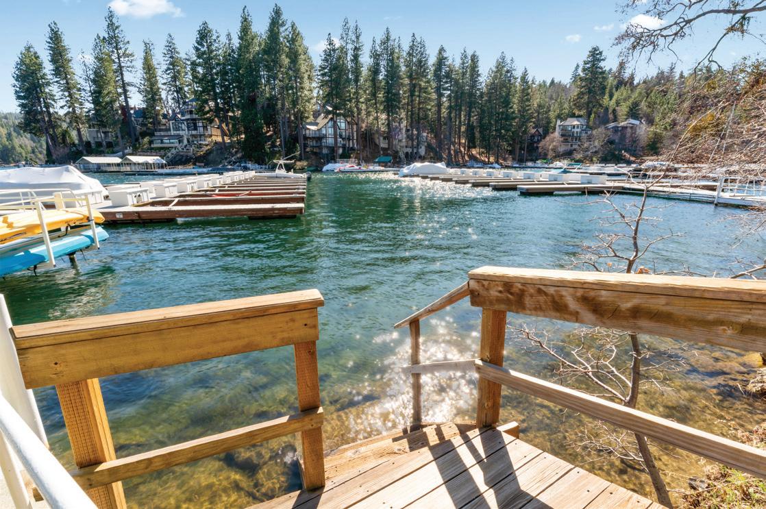 living room with lava rockfireplace, knotted pine walls, slate tile floor, dining room, kitchen w/blackgranite countertops, and stainless-steel appliances is configured in an open floorplan with soaring Cathedral ceilings. Double sliders frame the huge bank ofwindows opening outinto a forestenclave (with apple, maple and oaktrees). Potential ADU with separate entrance on lowerlevel includes a living room with brickfireplace & anotherprimary bedroom suite. Home has Lake Rights, central air, two access points and plentiful parking.