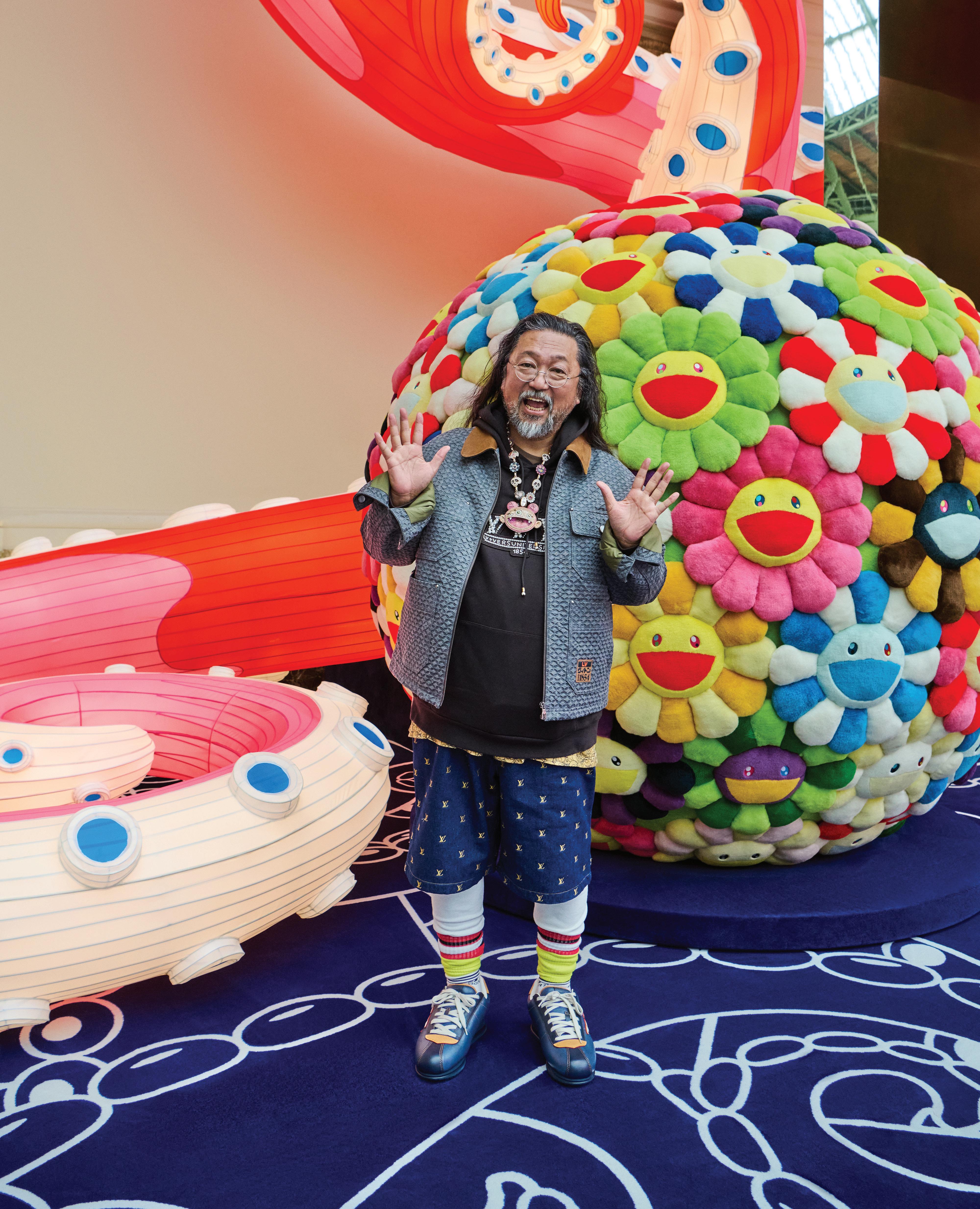 MAKING FACES TOKYO-BORN-ARTIST TAKASHI MURAKAMI, THE MASTERMIND BEHIND THIS EXTRAORDINARY LV COLLABORATION, HAS REDEFINED CONTEMPORARY ART BY BLENDING TRADITIONAL JAPANESE PAINTING WITH THE VIBRANT WORLDS OF ANIME, SCIENCE FICTION, AND POP CULTURE. HIS ‘SUPERFLAT’ ART DESIGN EXECUTION—CHARACTERIZED BY RECURRING MOTIFS OF SMILING FLOWERS, MUSHROOMS, AND EYES—HAS BECOME SYNONYMOUS WITH THE KAWAII (MEANING CUTE OR ADORABLE IN JAPANESE) AESTHETIC. MURAKAMI’S WORK HAS GRACED THE HALLS OF THE WORLD’S MOST PRESTIGIOUS INSTITUTIONS, FROM THE MUSEUM OF CONTEMPORARY ART IN LOS ANGELES TO THE GUGGENHEIM IN BILBAO.