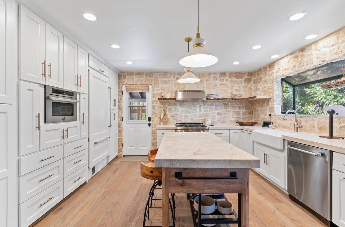 kitchen w/blackgranite countertops, and stainless-steel appliances is configured in an open floorplan with soaring Cathedral ceilings. Double sliders frame the huge bank ofwindows opening outinto a forestenclave (with apple, maple and oaktrees). Potential ADU with separate entrance on lowerlevel includes a living room with brickfireplace & anotherprimary bedroom suite. Home has Lake Rights, central air, two access points and plentiful parking.