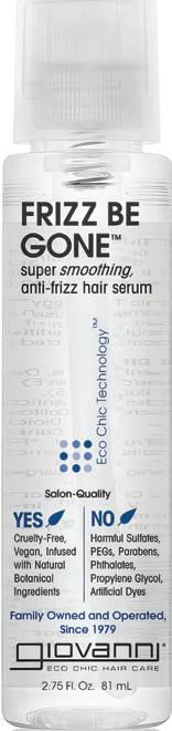 T3 SINGLEPASS CURL X EXTRALONG CERAGLOSS™ CERAMIC BARREL CURLING IRON. $149.99, T3MICRO.COM GIOVANNI FRIZZ BE GONE™ SUPERSMOOTHING, ANTI FRIZZ HAIR SERUM, $11.99, GIOVANNICOSMETICS.COM GIOVANNI 2CHIC® FRIZZ BE GONE™ TAMING CREAM, $10.99, GIOVANNICOSMETICS.COM ULTRA MOIST SUPER POTION ANTIFRIZZ & BINDING SERUM OIL, $11.99, GIOVANNICOSMETICS.COM ANTI 1.