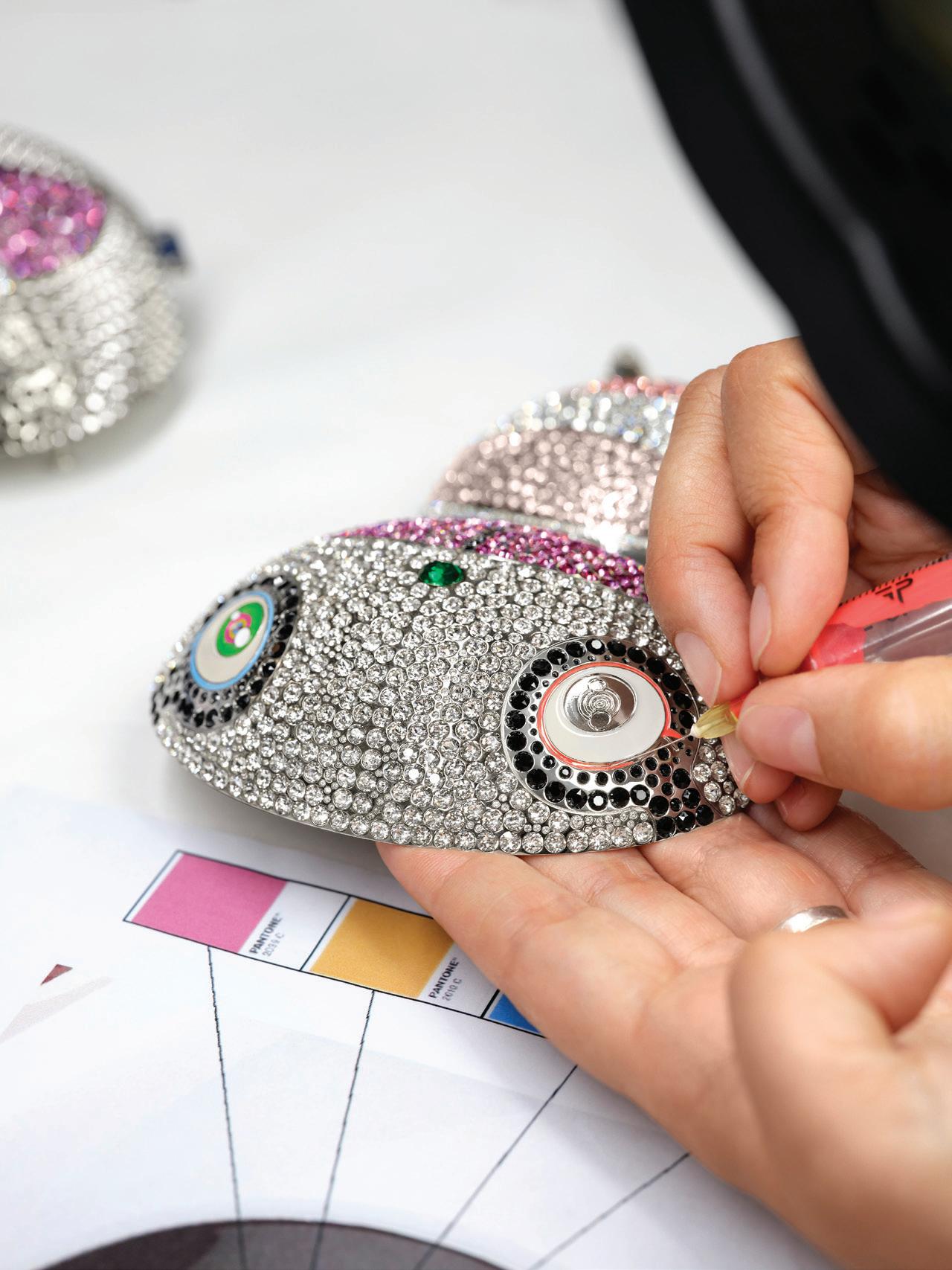 But the magic doesn’t stop there. The Capucines Mini Tentacle and Capucines MM Eye bags channel the octopus’s features, while the Capucines Mini Mushroom bag takes us on a psychedelic journey through a forest of 100 meticulously hand-embroidered, 3D-printed mushroom characters. Each piece, like the Panda Clutch—studded with strass and inspired by Murakami’s beloved panda character—is a miniature universe, showcasing LV’s ability to transform leather into art.