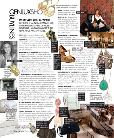 Basically everywhere. I love Barneys for shoes. Antique home shops SHOPPER I.D.: I’m an impulse buyer. If I see Beth Orduña on the Lower East Side of New York. Distant Origin, 153 Mercer something that I know is handmade somewhere in a small village, as opposed to mass-produced, I ring, $5500, Distant Origin for great gifts. And of St, New York, 212-941course, the Gap for my kids. just have to have it. If I don’t get it, I’ll just keep Miriam 0024, distantorigin.com thinking about it and have to go back and try and Claudette, WHAT ARE YOU 310-659find it all over again. BUYING LATELY? I’ll never need 9099 another handbag, so instead I double WHERE ARE YOU SHOPPING? Midnight Farm up on shoes! Recently, I bought a pair in Martha’s Vineyard. It’s my favorite store in the Bottega Venof black suede Balenciaga highU.S. Tamara (the co-owner, with Carly Simon) has eta multi-floral heeled oxfords and Miu Miu such eclectic taste—Dosa Clothing designs, the best Nappa sandal, pumps. I love my Bottega hand-selected home furnishings and art, Calleen Cordero $1290, Veneta wedges. In the last wonderful candles, and the most exquisite Bottega Venfew months I’ve really focused Kooba Dale jewelry; my personal favorite is this I Profumi di eta boutiques, my attention on my home, and I love picking up bag in pyFirenze amber oil that I can wear every day—I just 877-362new accessories that can mix things up a thon, $895, love it. Martha’s Vineyard has so many wonderful 1715 Irene Neuwirth Traffic, LA, Beth Orduña bit…trays, frames, and vintage objects. shops, and it’s so relaxing that I now take my two gold necklace 323-969moonstone ring, kids, Colin and Kai, there every summer for a week. ACCESSORY FAVES YOU CRAVE: Since we make with rose-cut $4180, Miriam 1962 accessories, my new favorite items for spring are WHAT ARE YOU BUYING LATELY? I do a lot of trading chrysoprase and Claudette, 310the Dale in printed python and our black patent- turquoise cabowith other designers, and for clothing, I love Ali Blankley 659-9099 for Hazel Brown. Her designs are exquisite, and the quality leather wallet that I’ll carry around at night as a chons, $11,290, is some of the best out there. They even go so far as to dye clutch. I’m also craving an Irene Neuwirth long Barneys New pendant necklace that I keep visiting, but haven’t York, Beverly Hills, fabrics in tea bags, and I just love her craftsmanship. Beth splurged on—yet. Orduña for Beth Orduña Jewelry is another favorite of 310-276-4400 mine. She has been in the business a long time, and her HIDDEN TREASURES: Zero in NYC. I can always find interestpieces are pretty magnificent. Love Heals is another favor- ing tops and other great pieces there to add to my wardrobe, ite, with every piece made up in Ojai. Over the last couple and the people are so friendly. Anthropologie always has fun, MIDNIGHT FARM: of years, I have been building a retreat center in Ojai called novelty gift ideas. 18 Water-Cromwell Irene Neuwirth moonstone Small white Calliote Canyon; I’m in the final stages of decorating there Lane, Vineyard Haven, marquise cluster necklace, patent-leather and have found some pretty amazing pieces of art right MA, 508-693-1997, $5730, Barneys New York, wallet, $225, there in Ojai. One of my favorites is Shastra at ZS Gallery. midnightfarm.net Beverly Hills, 310-276-4400 kooba.com I just purchased a beautiful oil painting from them.