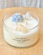 LEFT: TINY BANDIT SEA ELIXIR CANDLE WHOSE PROCEEDS BENEFIT THE SURFRIDER FOUNDATION. CLOCKWISE FROM TOP: HEATHER BEAUDOIN PLACING CRYSTALS IN HER CANDLES; MINI CRYSTAL MUSH ROOMS GUARANTEED TO SPARK JOY, $6.