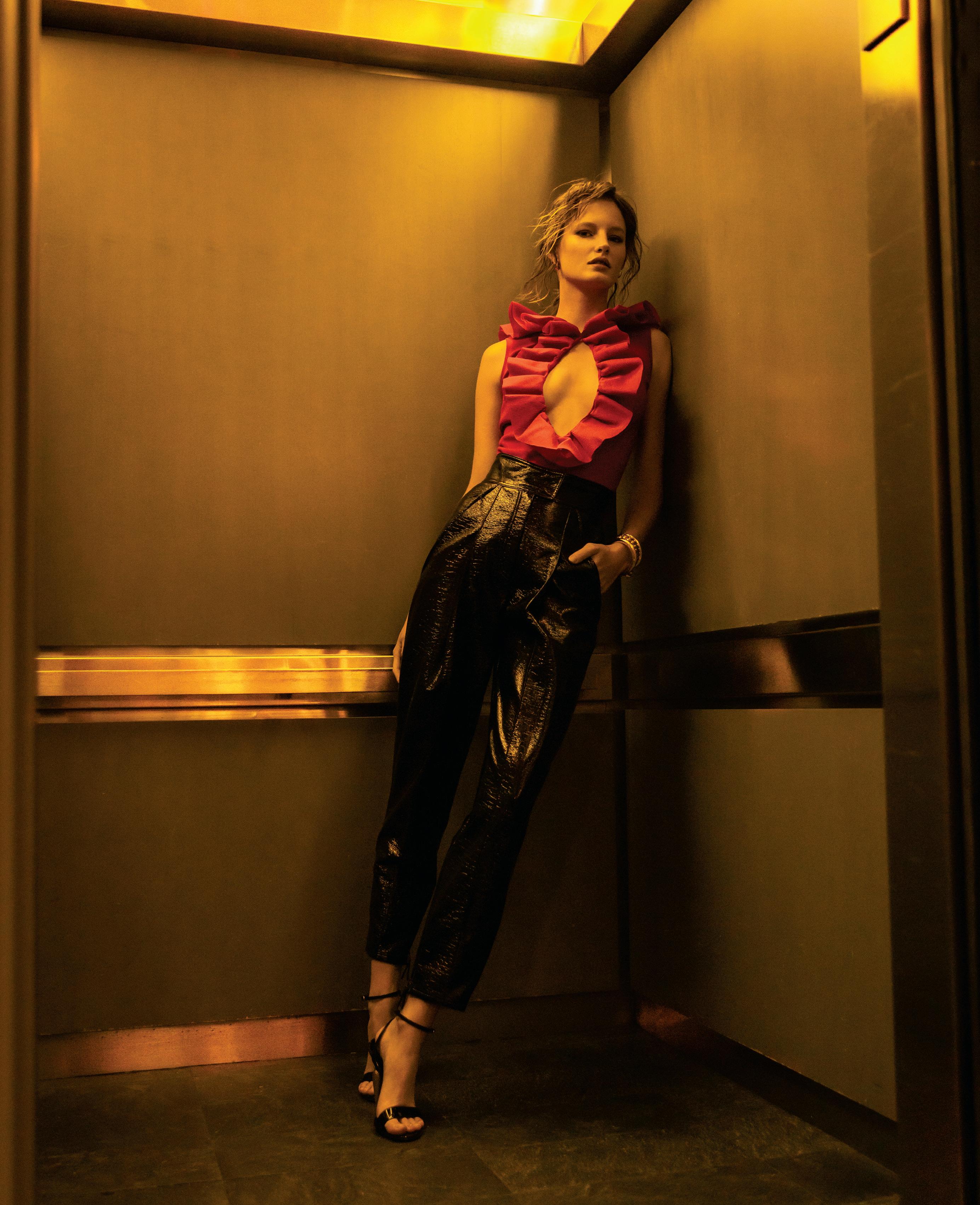 FERRAGAMO CERINO RED RUFFLE DETAIL TOP, $1890, AVAILABLE AT FERRAGAMO BOUTIQUES NATIONWIDE OR FERRAGAMO.COM; GIORGIO ARMANI BLACK HIGHWAISTED TROUSER IN COATED BLACK JERSEY, $1395, SELECT GIORGIO ARMANI BOUTIQUES NATIONWIDE OR ARMANI.COM