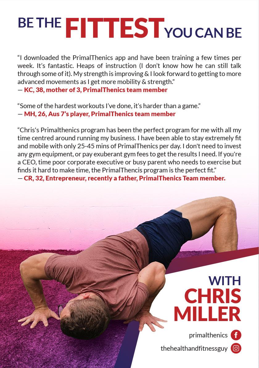 TheprogramistheworkofChris Millerwhowasinspiredtocreate PrimalThenicsaftersufferingaserious kneeinjuryinhisearlytwenties. Inanefforttoaddressboththephysiological andneurologicaldamageincurred,Chris eschewedtraditionalrehabilitationprograms tofocusonhisownresearch.