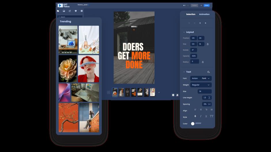 Thevideocreationplatform combinesthepowerofGPT-4’s AItechnologywithprofessional videoeditingtocreatesalesand marketingcontentonanyideaor keywordyouchoose.