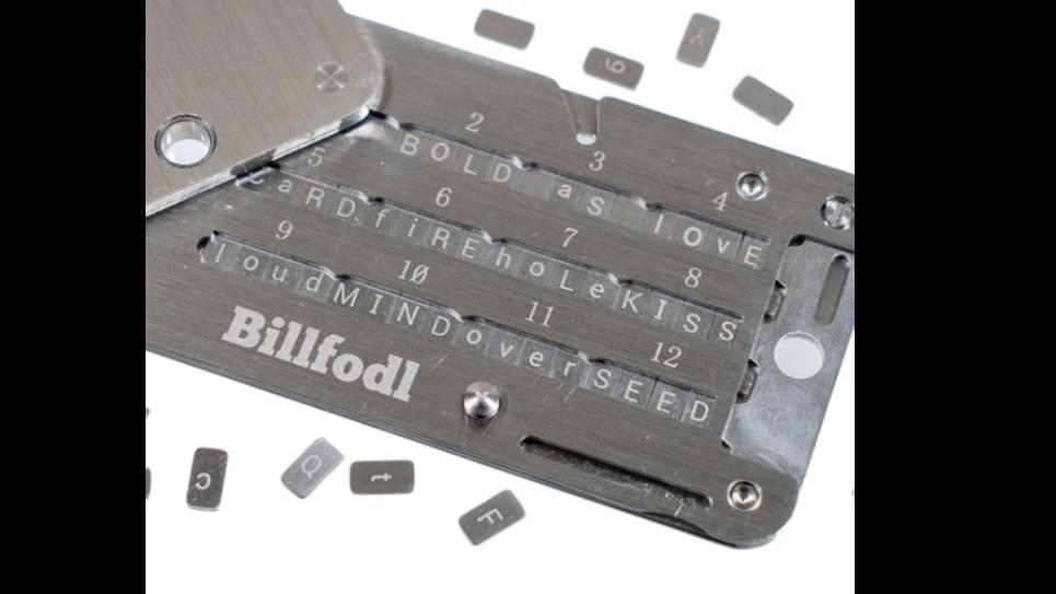 TheyareofferingtheBillfodlstoragedevice asatried-and-testedsecurephrasestorage solution,compatiblewitheveryhardware walletavailableontheironlinestore. Thedeviceismadefrombrushedmetal stainlesssteelwhichallowstheinputofup tothreeseedphrasesorprivatekeys throughtheuseoflaser-engravedtiles.