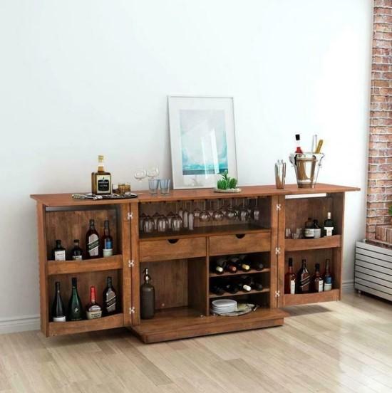 Featuringtwodrawers,asizablewinerack,andplentyofspacetostoreyour glassesandstemware,itscompactconstructionopensouttoprovideample