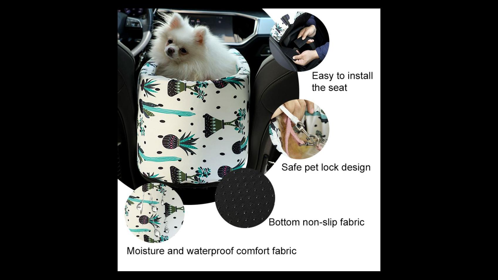 Thiscarseatandbooster fromEmerswaremakesit easytokeepyoursmalldog orkittensafe,andoutofthe driver’sway.