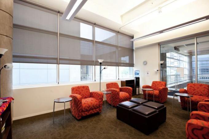 Thecompanyhasawideselectionofroller shadesinvariouscolorsandtexturesthat shieldyourofficefromthesunwithout completelyblockingtheviewandoutside light.