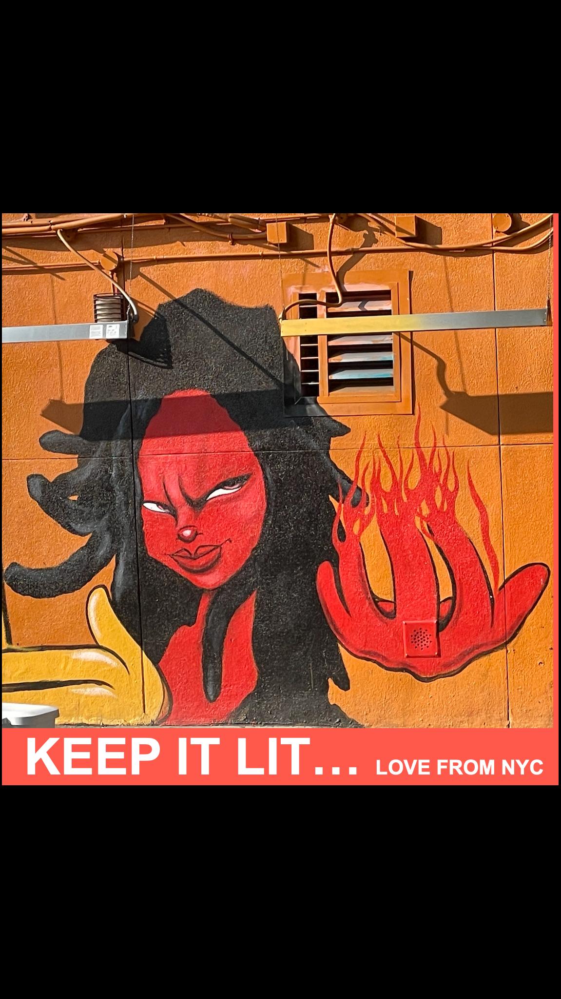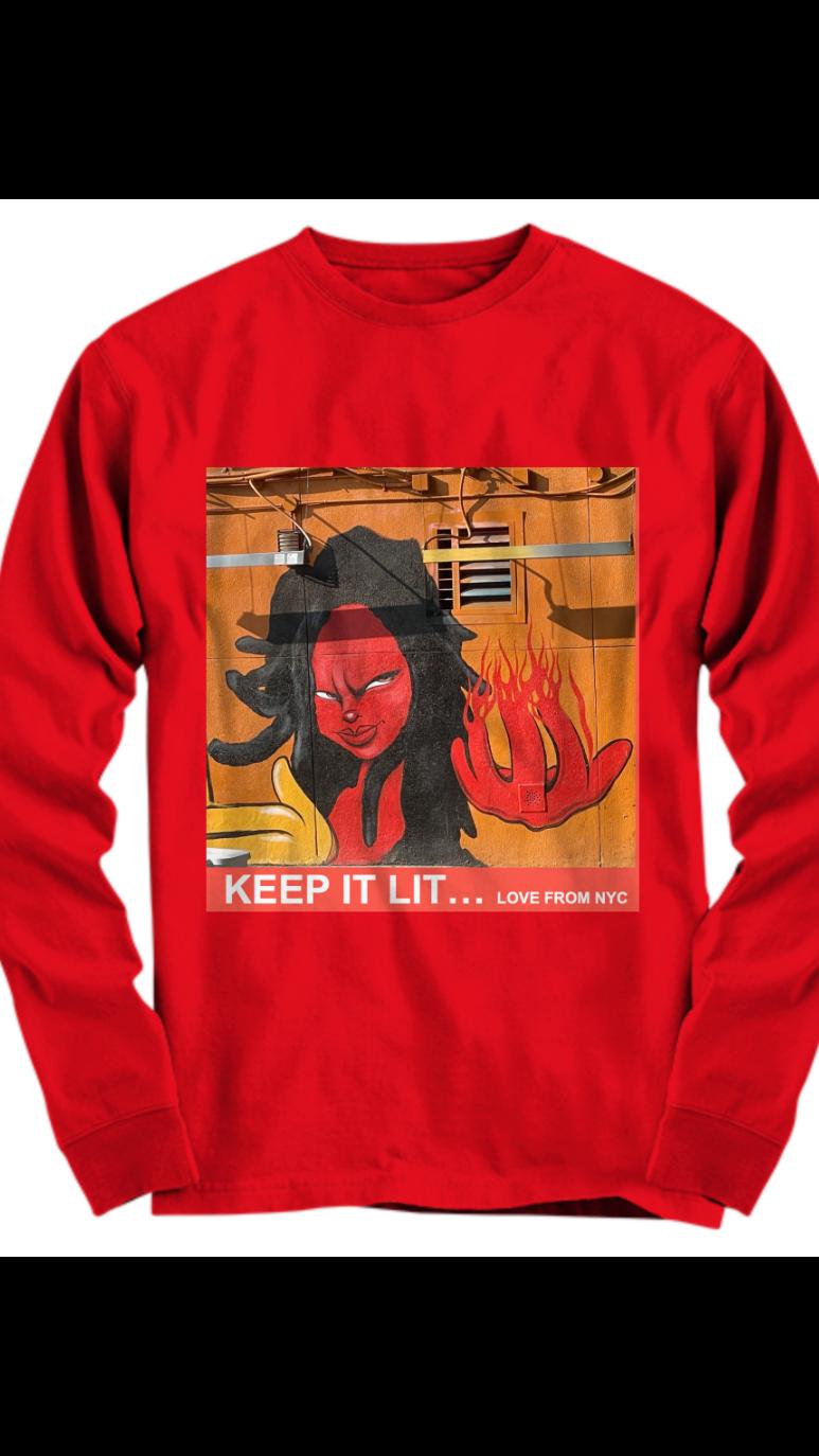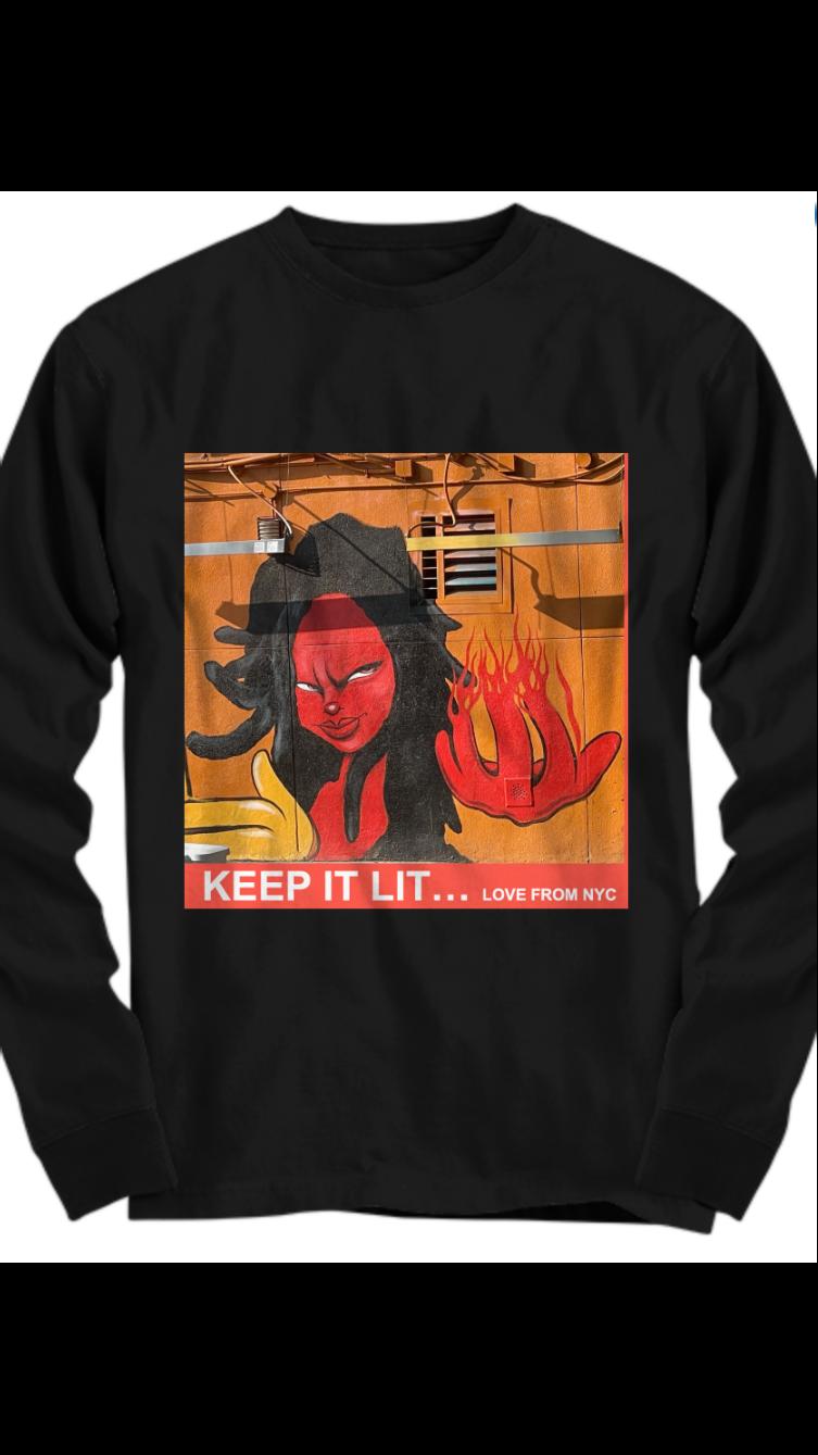 Theirnewt-shirt—thefirstoftheirnewseriesonNYC’s famousstreetart—iscalled‘RedGirlFieryHand-KeepIt Lit’.