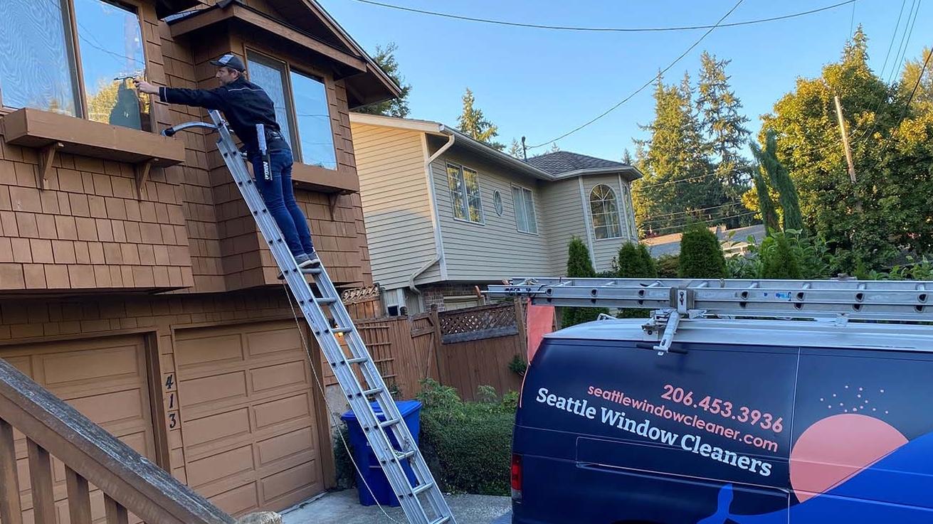 SeattleWindowCleaners'crewis skilledatusingrope-and-harness systems,seatboards,ladders, andextensionpoleswhen cleaningareasthataredifficultto reach.
