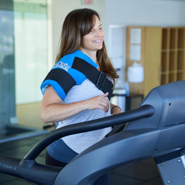 Thecryotherapywrap’sthree-inch-wideelastic strapskeepitfirmlyinplaceevenwhenyouarein motion.
