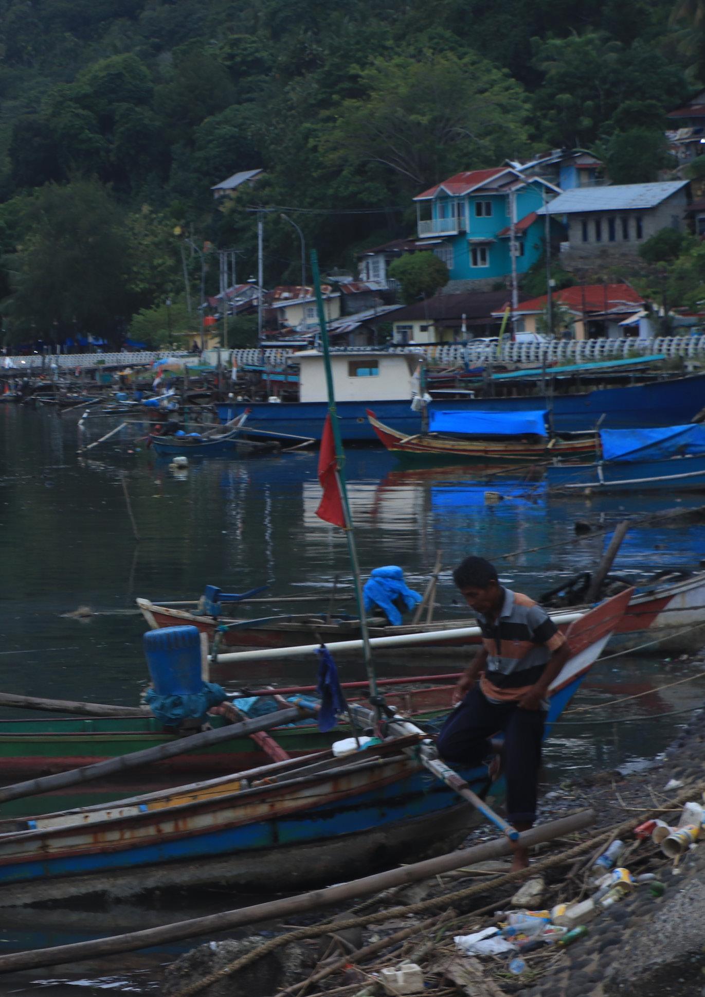 Hamparan air di muara bergelombang kecil menghanyutkan barisan sampah melewati seorang nelayan bersama sahabatnya, perahu kayu di dermaga tumpukan sampah. Dua sahabat itu bersiap untuk mengarungi muara.