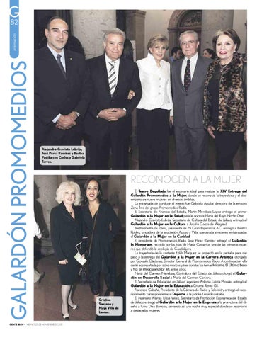 El Teatro Degollado fue el escenario ideal para realizar la XIV Entrega del Galardón Promomedios a la Mujer, donde se reconoció la trayectoria y el desempeño de nueve mujeres en diversos ámbitos. La encargada de conducir el evento fue Gabriela Aguilar, directora de la emisora Zona Tres del grupo Promomedios Radio. El Secretario de Finanzas del Estado, Martín Mendoza López entregó el primer Galardón a la Mujer en la Salud para la doctora María del Rayo Morfín Oter. Alejandro Cravioto Lebrija, Secretario de Cultura del Estado de Jalisco, entregó el Galardón a la Mujer en la Cultura a Arcelia García de Weigand. Bertha Padilla de Pérez, presidenta de Mi Gran Esperanza, A.C. entregó a Beatriz Robles, fundadora de la asociación Apoyo y Vida, que ayuda a mujeres embarazadas el Galardón a la Mujer en la Caridad. El presidente de Promomedios Radio, José Pérez Ramírez entregó el Galardón In Memoriam, recibido por las hijas de María Casparius, una de las primeras mujeres que defendió la ecología de Guadalajara. La trayectoria de la cantante Edith Márquez se proyectó en la pantalla para dar paso a la entrega del Galardón a la Mujer en la Carrera Artística otorgado por Gonzalo Cárdenas, Director General de Promomedios Radio. A continuación ella cantó acompañada por ocho músicos y tres coristas los temas Mírame, El Último Beso y No te Preocupes Por Mí, entre otros. María del Carmen Mendoza, Contralora del Estado de Jalisco otorgó el Galardón en Desarrollo Social a María del Carmen Corvera. El Secretario de Educación en Jalisco, ingeniero Antonio Gloria Morales entregó el Galardón a la Mujer en la Educación a Cristina Romo Gil. Francisco Cabaña, Presidente de la Cámara de Radio y Televisión, entregó el reconocimiento correspondiente al Deporte a la judoka Lenia Ruvalcaba. El ingeniero Alonso Ulloa Vélez, Secretario de Promoción Económica del Estado de Jalisco entregó el Galardón a la Mujer en la Empresa a la promotora del diseño a Gina Diez Barrozó, cerrando así una noche muy especial donde se reconoció a destacadas mujeres.