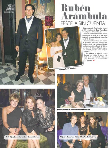 Rubén Arámbula Curiel recibió a cerca de 300 invitados en la Casa Pedro Loza para festejar sus 50 años de vida. Él decidió celebrar este día tan especial contando con el apoyo de su hija Sabina Arámbula; los encargados del evento fueron CHG Groups. Recibieron a los invitados con cocteles de guanábana, tamarindo, fresa y guayaba, entre otros, y se ofrecieron canapés de Ceviche de Coco, Tostada de Atún en una Cama de Salsa de Chipotle, Taquitos de Tamarindo, servidos por el banquete Puerta 20. Del ambiente se encargó Mónica Zuloaga con música de jazz y más tarde el DJ Joao. Ya tarde hubo cena para desvelados y se sirvieron Lechón y Chilaquiles.