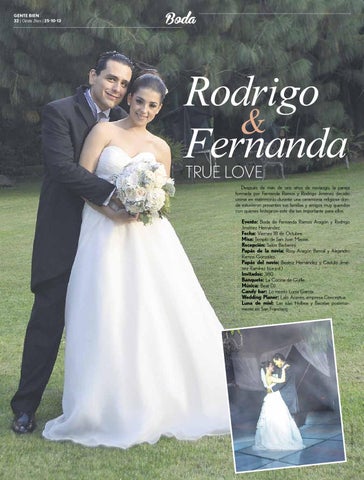 Evento: Boda de Fernanda Ramos Aragón y Rodrigo Jiménez Hernández. Fecha: Viernes 18 de Octubre. Misa: Templo de San Juan Macías. Recepción: Salón Barberini. Papás de la novia: Rosy Aragón Bernal y Alejandro Ramos González. Papás del novio: Beatriz Hernández y Cástulo Jiménez Ramírez (q.e.p.d.) Invitados: 380. Banquete: La Cocina de Guille Música: Beat DJ. Candy bar: Lo montó Lucía García. Wedding Planer: Lalo Aceves, empresa Conceptua. Luna de miel: Las islas Holbox y Bacalar, posteriormente en San Francisco.