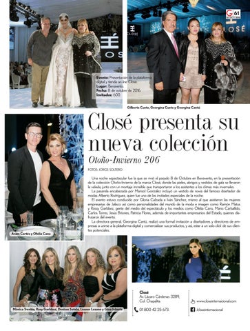 Una noche espectacular fue la que se vivió el pasado 8 de Octubre en Benavento, en la presentación de la colección Otoño-Invierno de la marca Closé, donde las pieles, abrigos y vestidos de gala se llevaron la velada, junto con un montaje increíble que transportaron a los asistentes a los climas más invernales. La pasarela encabezada por Marisol González incluyó un vestido de novia del famoso diseñador de modas Alberto Rodríguez, quien fue uno de los invitados especiales de la noche. El evento estuvo conducido por Gloria Calzada e Iván Sánchez, mismo al que asistieron las mujeres empresarias de Jalisco así como personalidades del mundo de la moda e imagen como Ramón Matus y Rossy Garbbez, gente del medio del espectáculo y los medios como Ofelia Cano, Mario Carballido, Carlos Torres, Jesús Briones, Patricia Flores, además de importantes empresarios del Estado, quienes disfrutaron del evento. La directora general, Georgina Cantú, realizó una formal invitación a diseñadores y directores de empresas a unirse a la plataforma digital y comercializar sus productos, y así, estar a un solo click de sus clientes potenciales.